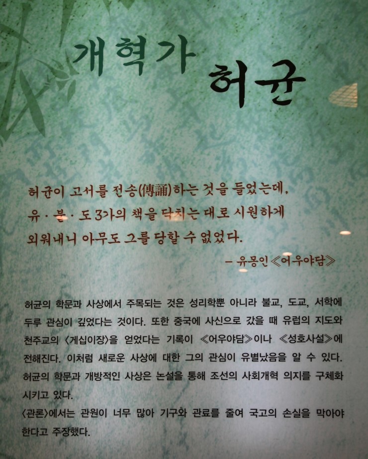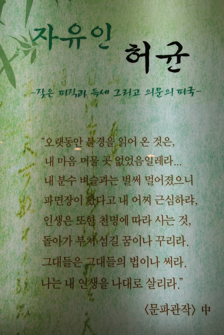'¿©·¯ ÇØ ¿¬À̾î Áß±¹ °¡´Â ±æ ºñ·Ï ÈûµéÁö¸¸/ ¿¾»ç¶÷ Ã¥ ¸¹ÀÌ ¾ò¾î ¿À´Â Áñ°Å¿ò ÀÖ³×/ °¡Áø °Í ÁË´Ù Åоî Ã¥ »ê´Ù°í ºñ¿ôÁö ¸¶¿À/ ³ª´Â ÀåÂ÷ Ã¥¹ú·¹°¡ µÇ·Á°í ÇÏ´Ï' ±×ÀÇ »ýȰÀº ¸Å¿ì ÀÚÀ¯ºÐ¹æÇß´ø µíÇÏ´Ù. Çã±ÕÀº Æò¼Ò ¡°Âü¼±ÇÏ°í ºÎó¿¡°Ô ÀýÇÒ Á¤µµ¡±·Î ºÒ±³¿¡ ´ëÇØ¼ È£ÀÇÀûÀÌ¾î¼ ¿©·¯ ¸íÀÇ ½Â·Áµé°ú ±³·ùÇÏ¿´À¸¸ç, ½ÅºÐÀû ÇѰè·Î ÀÎÇØ ºÒ¿îÇÑ »îÀ» »ì°í ÀÖ´ø ¼ÀÚµé°úµµ ±³·ùÇÏ¿´´Ù. ¶ÇÇÑ ¿äÁîÀ½ °°À¸¸é Áöź¹ÞÀ» ÀÏÀÌÁö¸¸, ±â»ý°ú Á¤½ÅÀûÀÎ ±³°¨À» ÇÒ Á¤µµ·Î ´ç½Ã·Î¼´Â ÆÄ°ÝÀûÀÎ »ýȰÀ» ÇÏ¿´´Ù. ÇÑ ¹øÀº ±×°¡ ¾Æ³¢´ø ºÎ¾ÈÀÇ ±â»ý °è»ýÀÌ Á×ÀÚ, ¡°½Å¹¦ÇÑ ±Û±Í´Â ºñ´ÜÀ» ÆîÃÄ ³õÀº µí(ÙØÏ£ÊíÐÓÐÞ)/ û¾ÆÇÑ ³ë·¡´Â °¡´Â ¹Ù¶÷ ¸ØÃß¾î¶ó(ôèʰú°ñÒê£)/ º¹¼þ¾Æ¸¦ µý ÁË·Î Àΰ£¿¡ ±Í¾ç ¿Ô°í(÷ÞÓþÕÎù»Í£)/ ¼±¾àÀ» ÈÉÃÆ´ø°¡ À̽ÂÀ» ¶°³ª´Ù´Ï(ï¼å·ËÛìÑÏØ)¡¦¡±¶ó¸ç ±×³àÀÇ Á×À½À» ¾ÖµµÇÏ´Â ½Ã¸¦ Áþ±âµµ ÇÏ¿´´Ù. °è»ýÀº À¯¸íÇÑ ºÎ¾È ±â»ý ¸ÅâÀÇ ´Ù¸¥ À̸§ÀÌ´Ù. ¿©±â¼ ¡°³²³à°£ÀÇ Á¤¿åÀº ÇÏ´ÃÀÌ ÁØ °ÍÀ̸ç, ³²³àÀ¯º°ÀÇ À±¸®´Â ¼ºÀÎÀÇ °¡¸£Ä§ÀÌ´Ù. ¼ºÀÎÀº Çϴú¸´Ù ÇÑ µî±Þ ¾Æ·¡´Ù. ¼ºÀÎÀ» µû¸£´À¶ó ÇÏ´ÃÀ» ¾î±æ ¼ö´Â ¾ø´Ù¡±°í ÇÑ Çã±ÕÀÇ ¹ß¾ðÀÇ ÅëÇØ¼ ±×ÀÇ »ýȰ ŵµ¸¦ ÁüÀÛÇØ º¼ ¼ö ÀÖ´Ù. ÀÌ °°Àº Çã±ÕÀÇ »ýȰ ŵµ´Â Çй®¿¡µµ ±×´ë·Î ¹Ý¿µµÇ¾î, ¡°±Û¾²´Â ÀçÁÖ°¡ ¸Å¿ì ¶Ù¾î³ª ¼öõ ¸¶µðÀÇ ¸»À» º×¸¸ µé¸é ½á ³»·Á °¬´Ù. ±×·¯³ª ÇãÀ§ÀûÀΠåÀ» ¸¸µé±â ÁÁ¾ÆÇÏ¿© »ê¼ö³ª µµÂü¼³°ú µµ±³³ª ºÒ±³ÀÇ ½Å±âÇÑ ÇàÀûÀ¸·ÎºÎÅÍ ¸ðµç °ÍÀ» °ÅÁþÀ¸·Î Áö¾î³Â´Ù¡±([±¤ÇرºÀϱâ])°í Æò°¡µÇ¾ú´Ù. ±×ÀÇ Çൿ°ú Çй®Àº ºÐ¸í ´ç½Ã·Î¼´Â ÆÄ°ÝÀûÀÎ °ÍÀÌ ¾Æ´Ò ¼ö ¾ø¾ú´Ù.